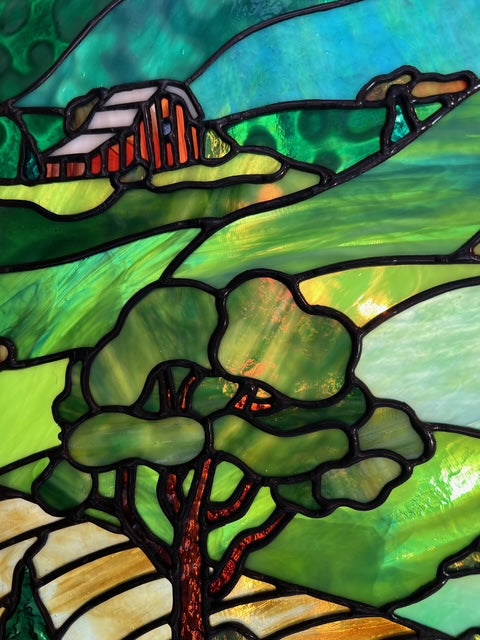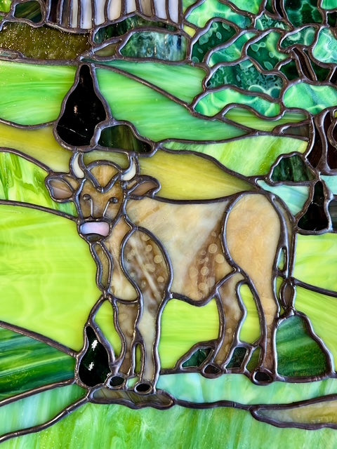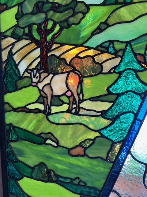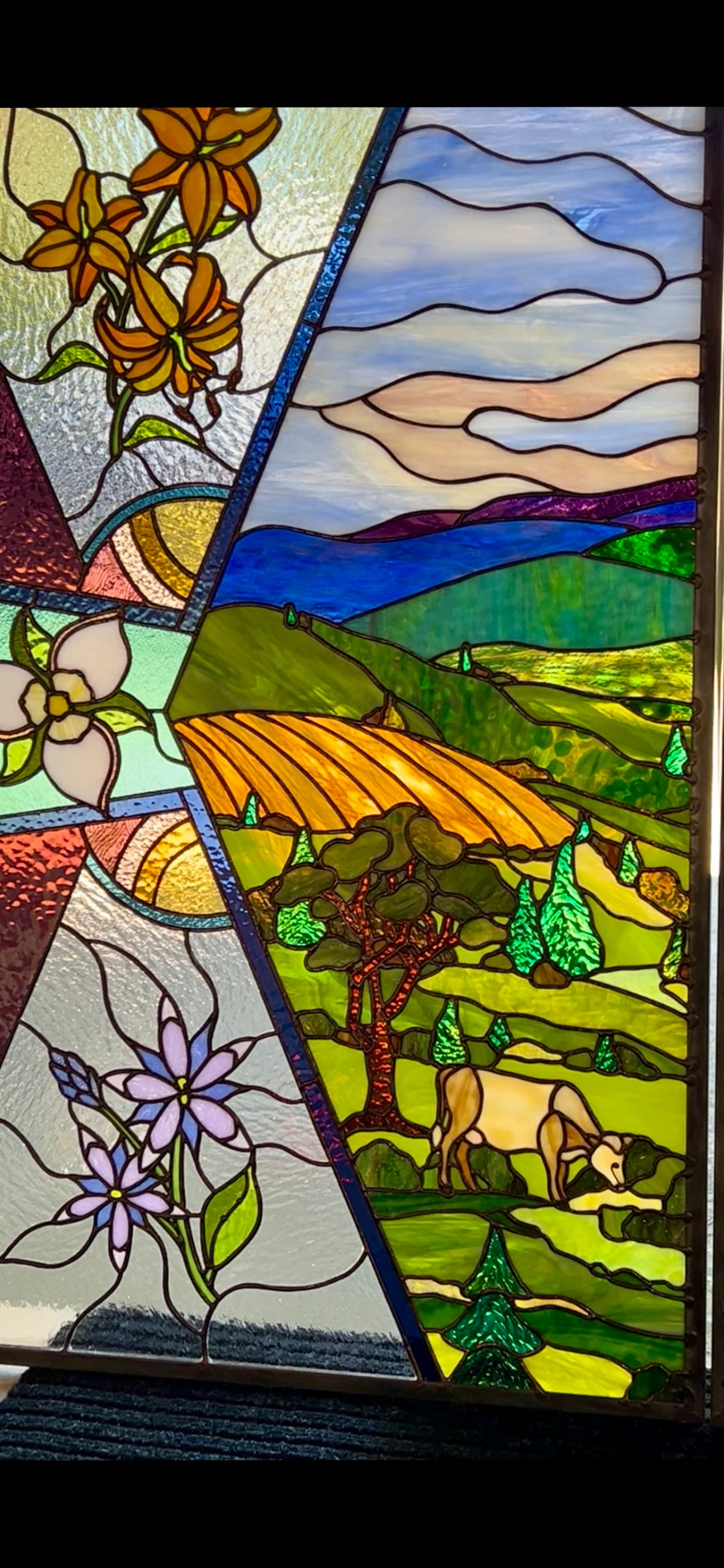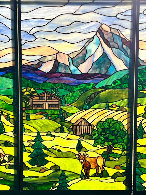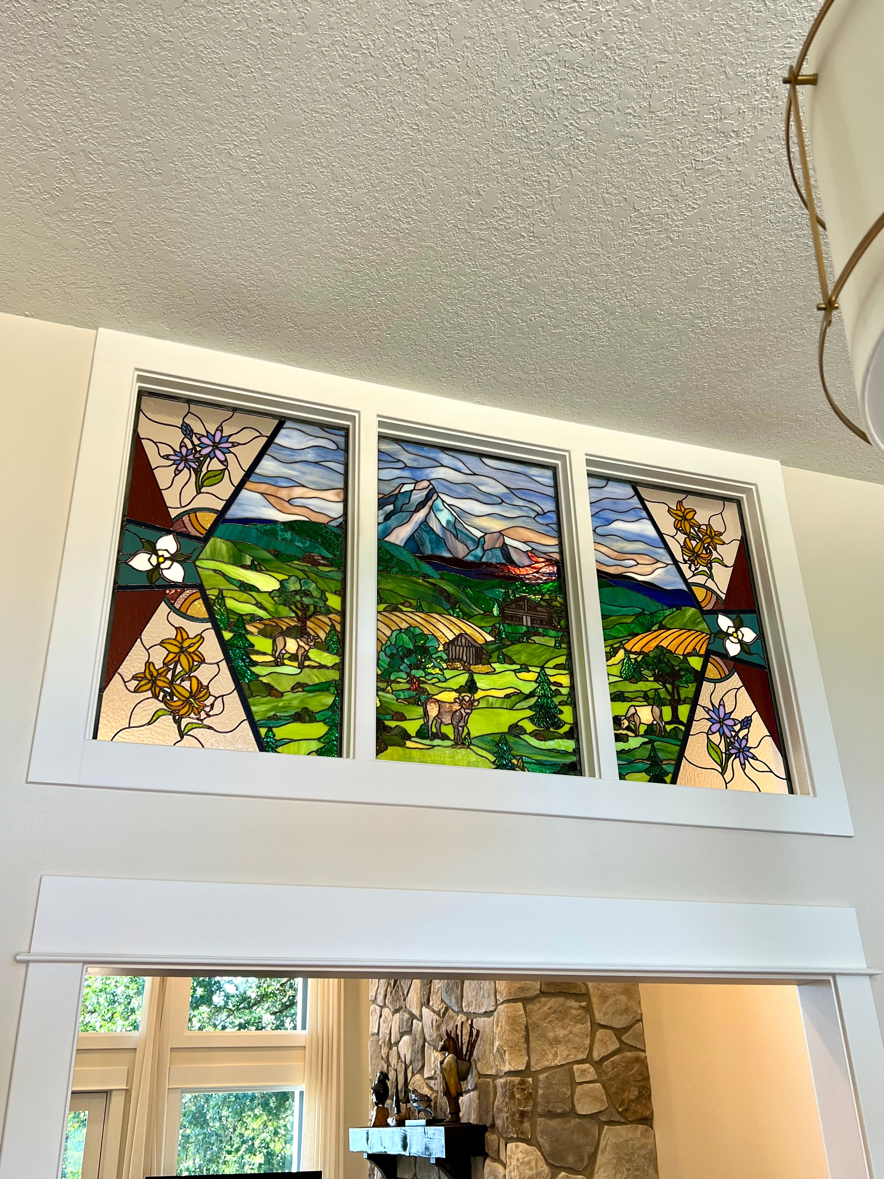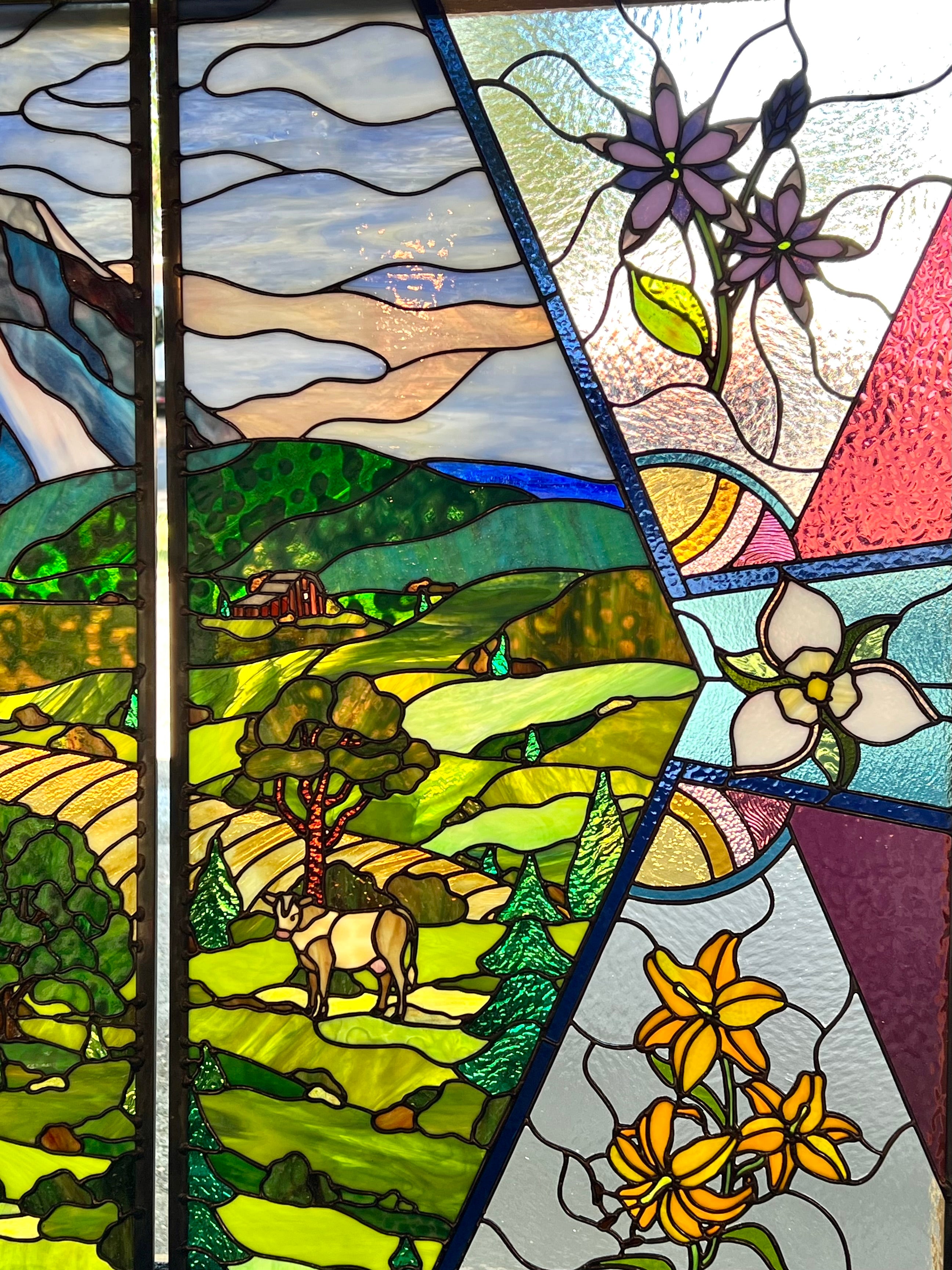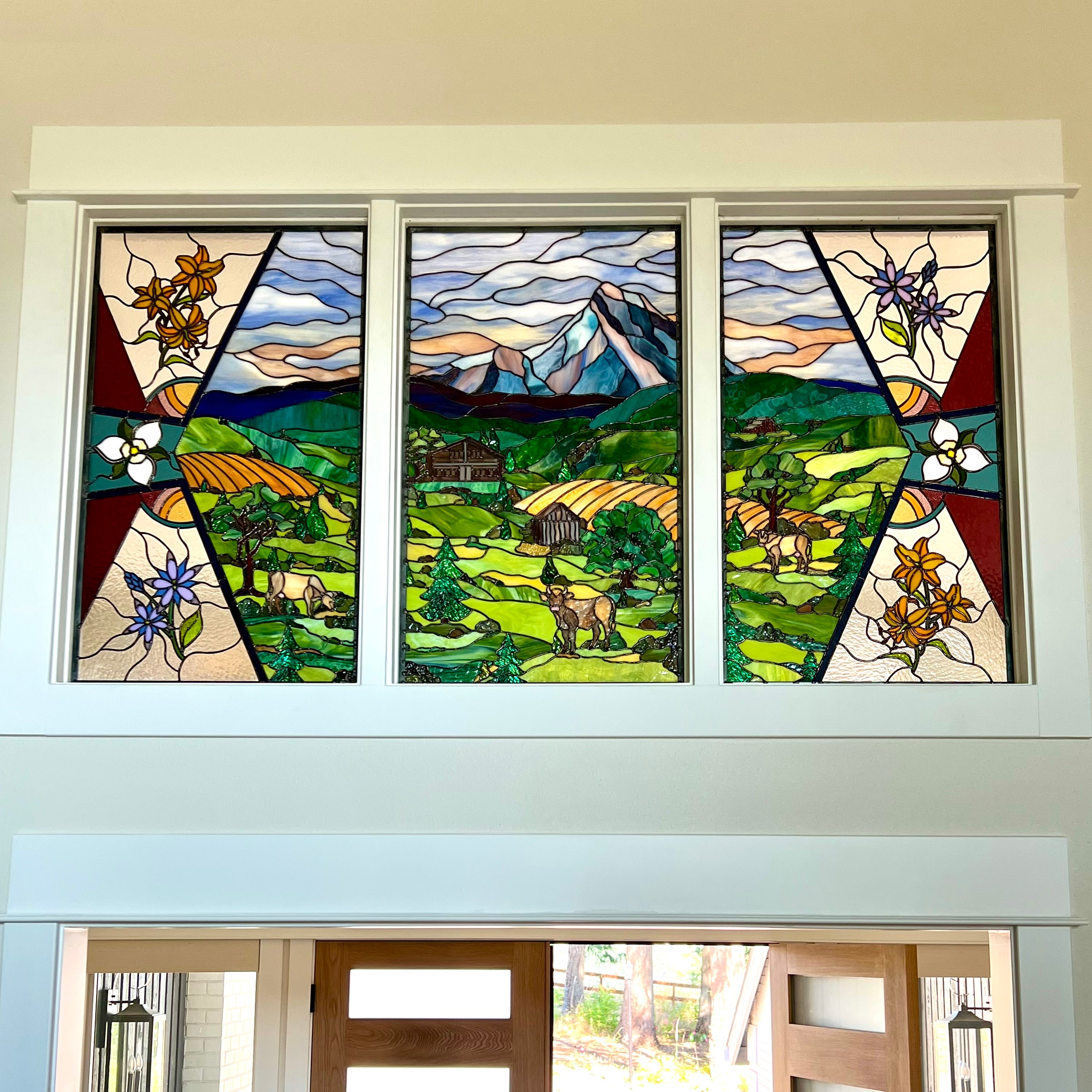 For "Helvetia Landscape," the client wanted to replace some existing transom windows with a custom stained glass triptych inspired by the view from their home. The design features Mt. Hood overlooking green rolling hills, amber wheat fields, roaming cows and a Swiss Chalet - capturing the charm of the local landscape. The scene is framed in a modern Art Deco -inspired boarder, accented with native Pacific Northwest flora: Trillium, Columbia Lily, and Camas Lily blossoms.