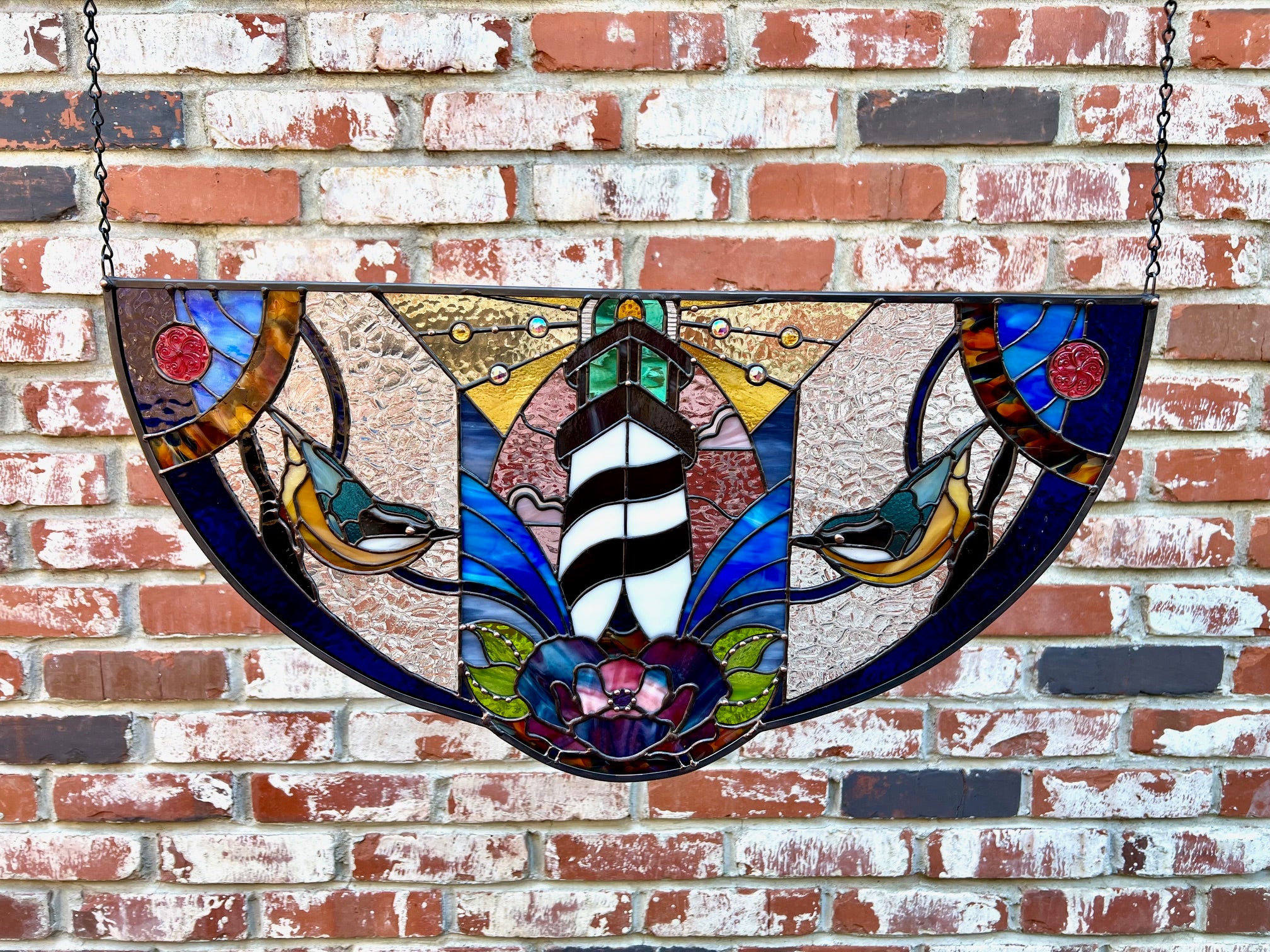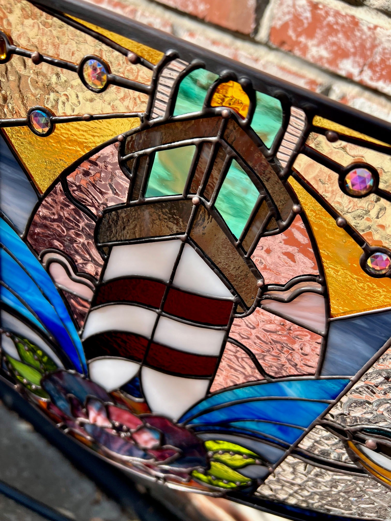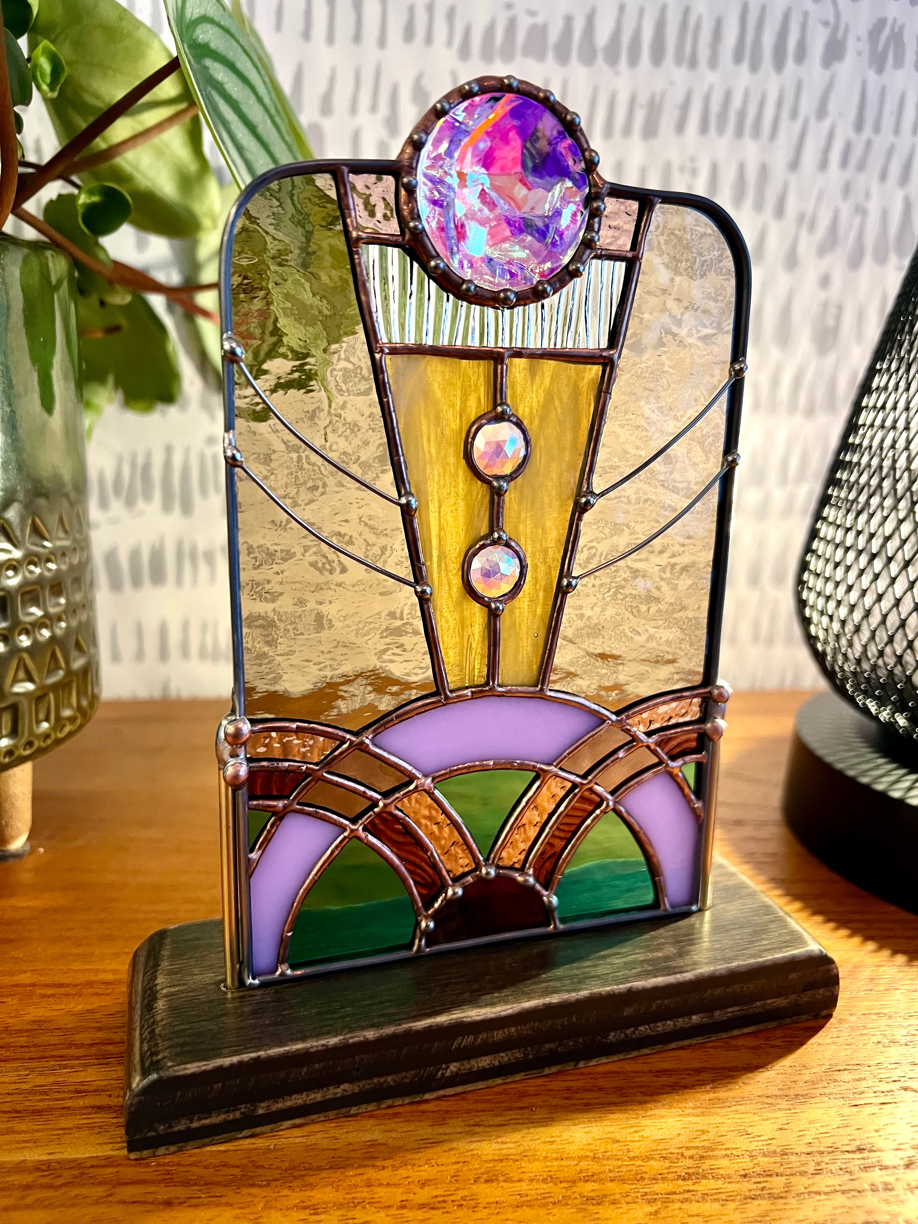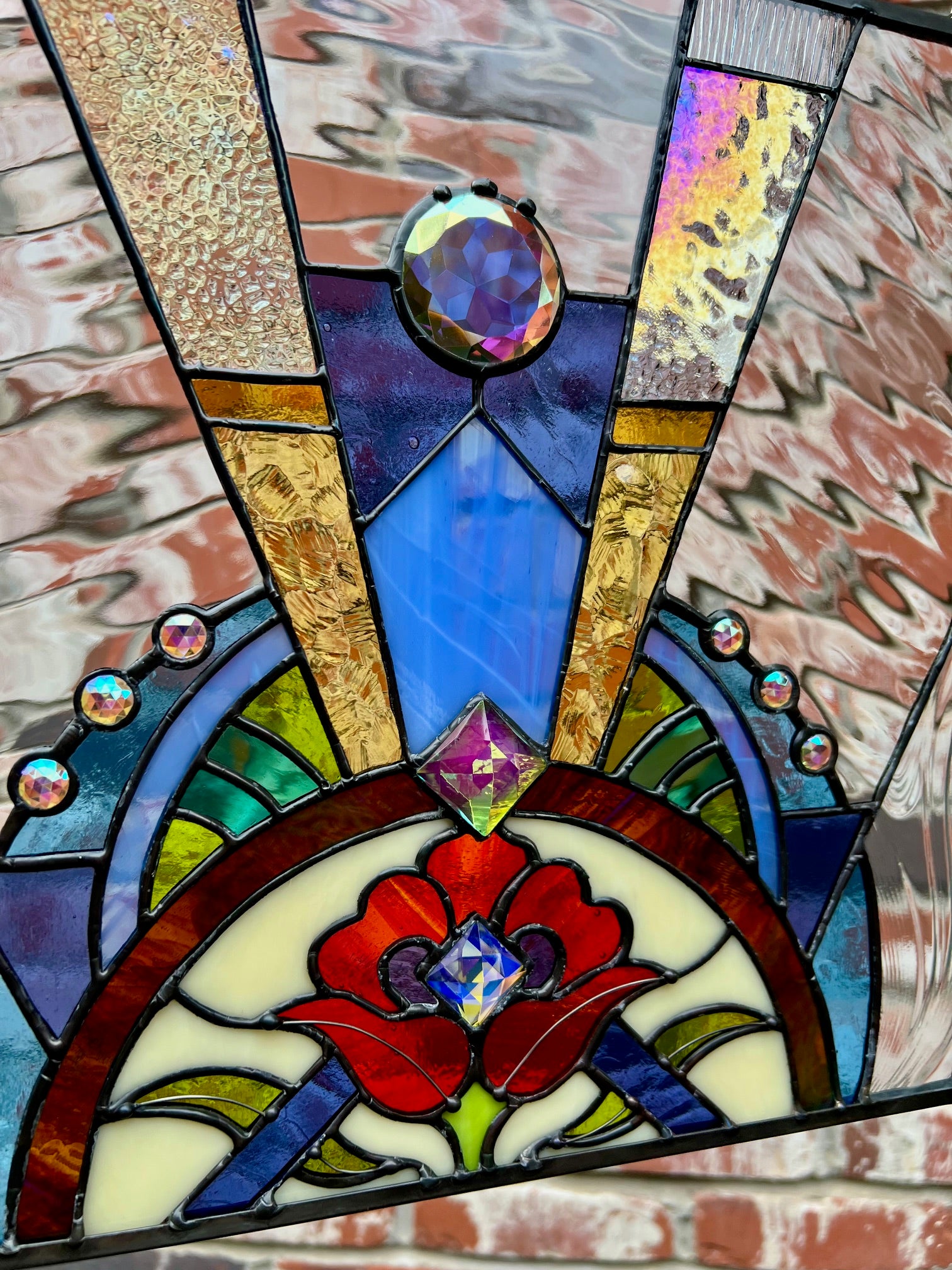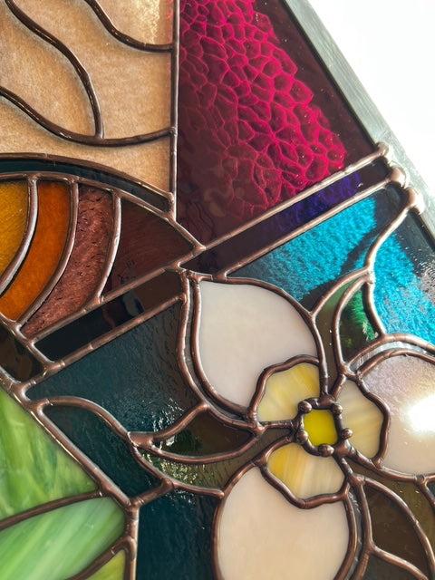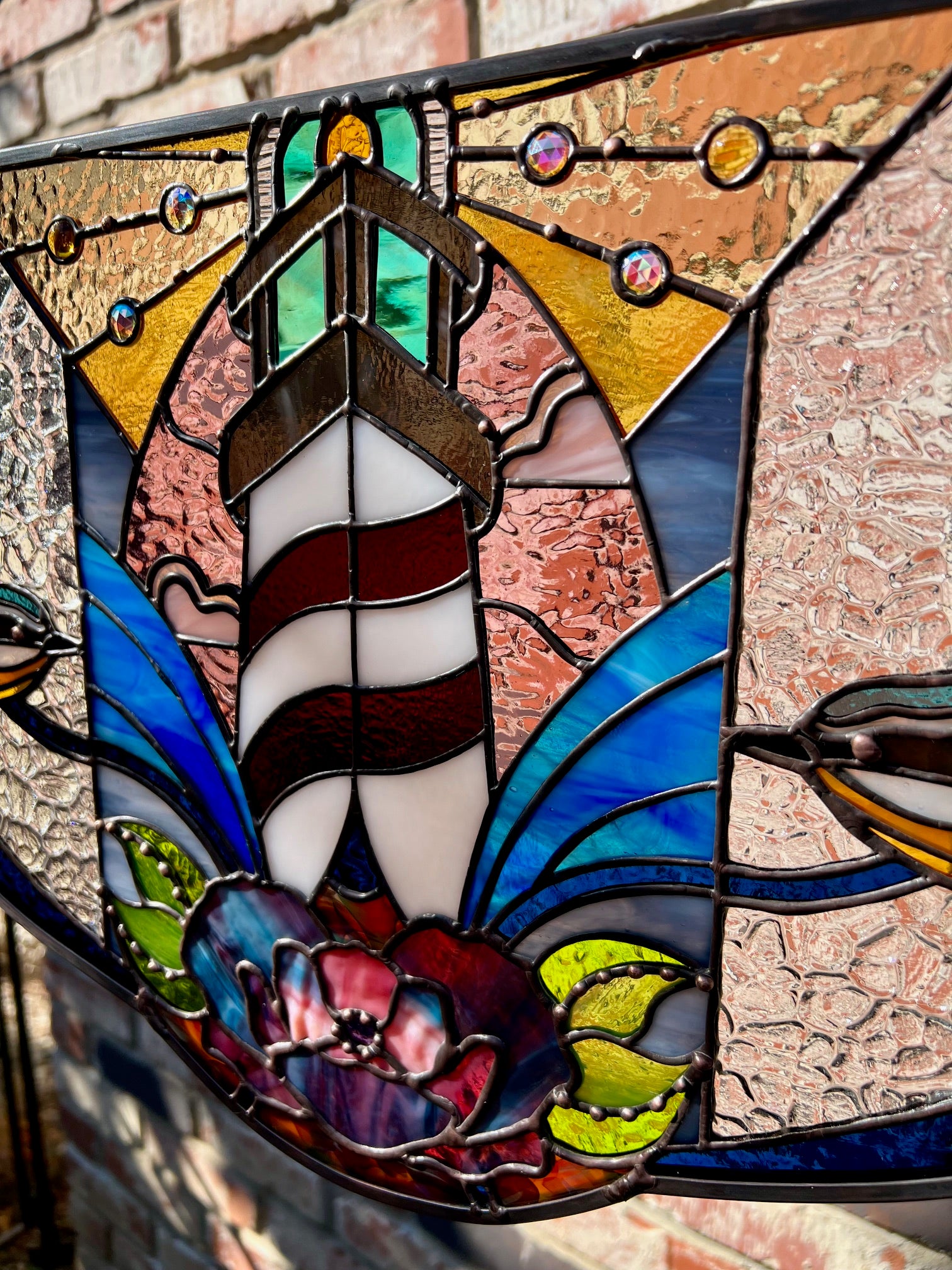 For "Helvetia Landscape," the client wanted to replace some existing transom windows with a custom stained glass triptych inspired by the view from their home. The design features Mt. Hood overlooking green rolling hills, amber wheat fields, roaming cows and a Swiss Chalet - capturing the charm of the local landscape. The scene is framed in a modern Art Deco -inspired boarder, accented with native Pacific Northwest flora: Trillium, Columbia Lily, and Camas Lily blossoms.