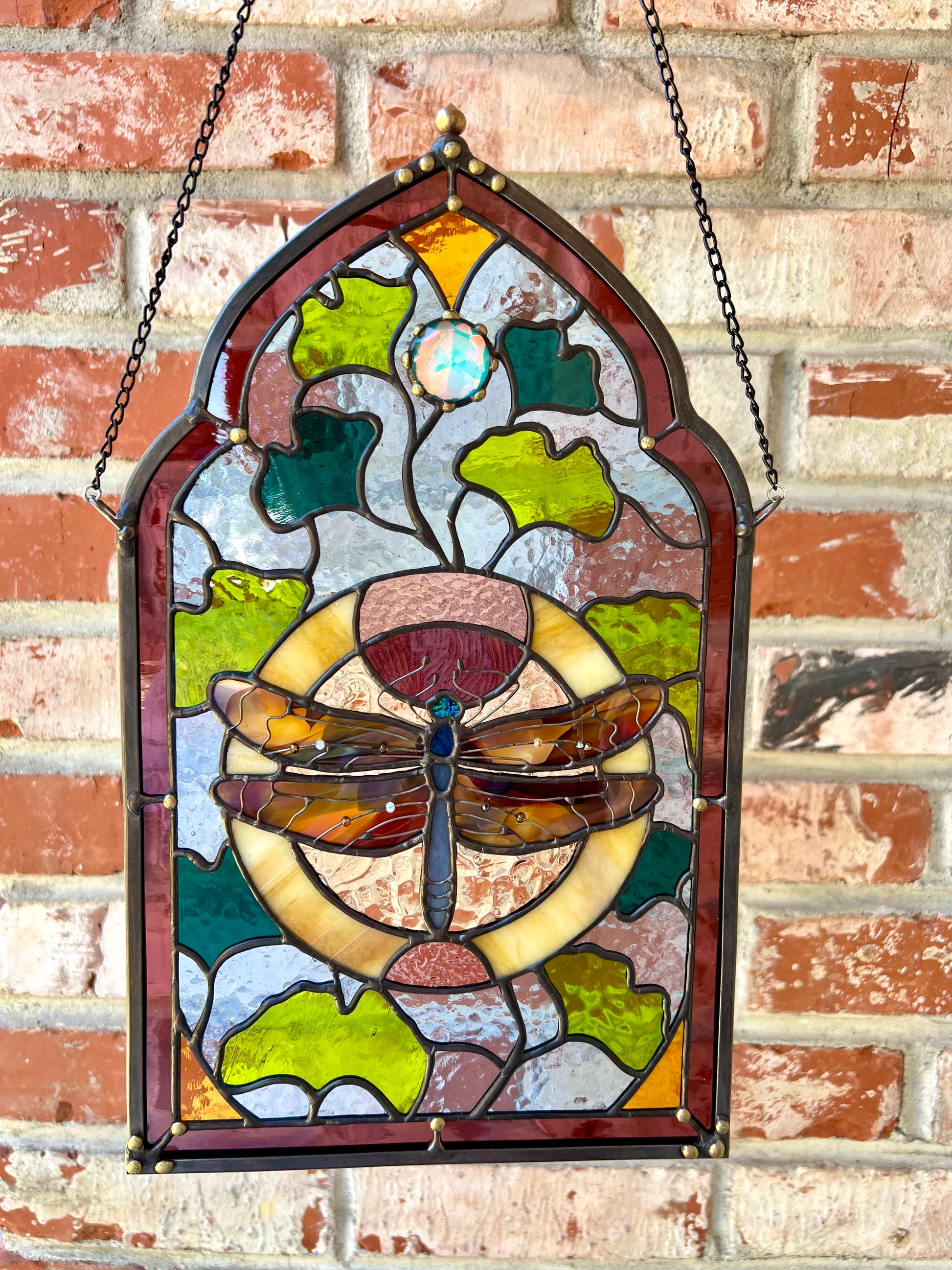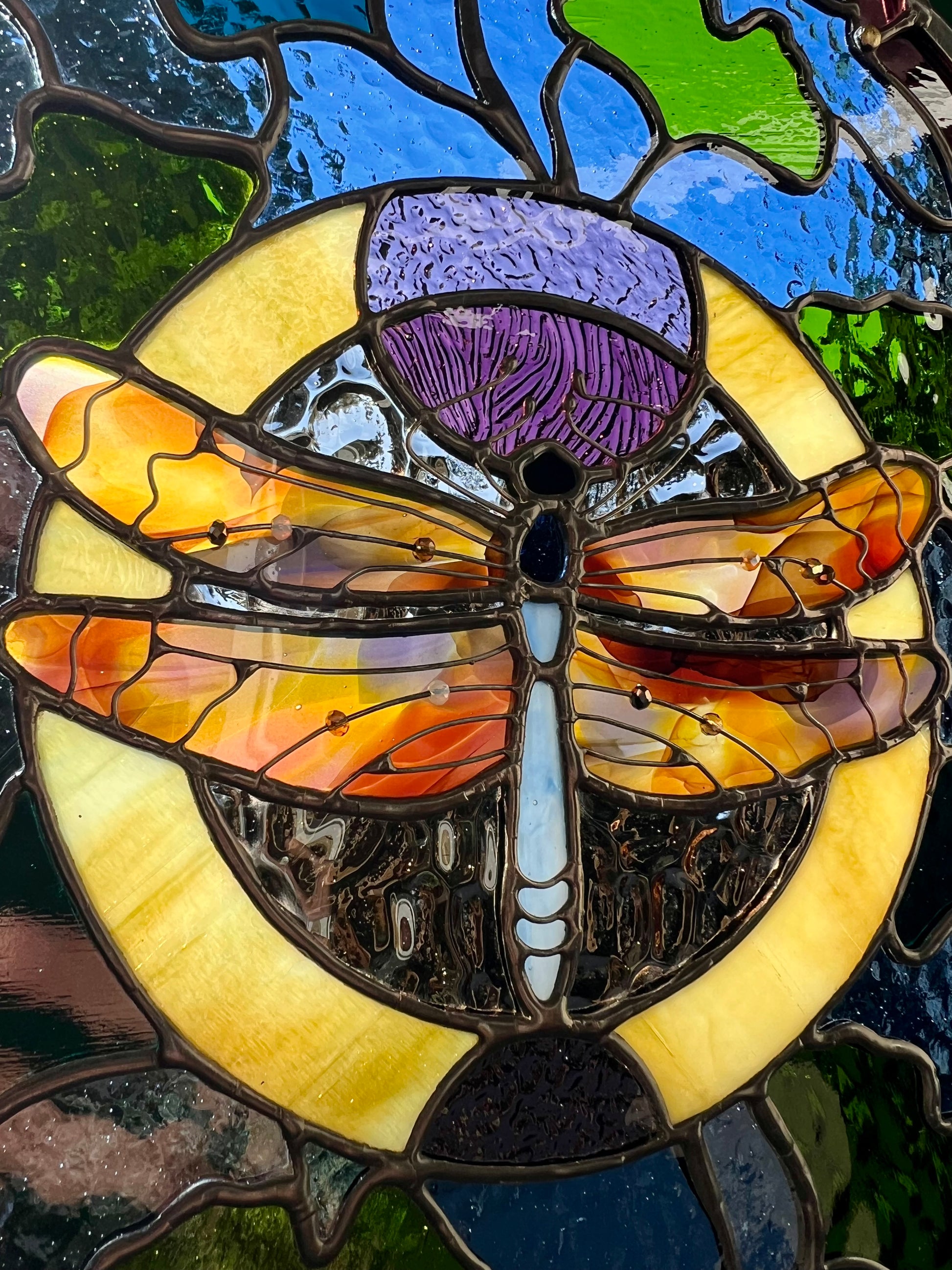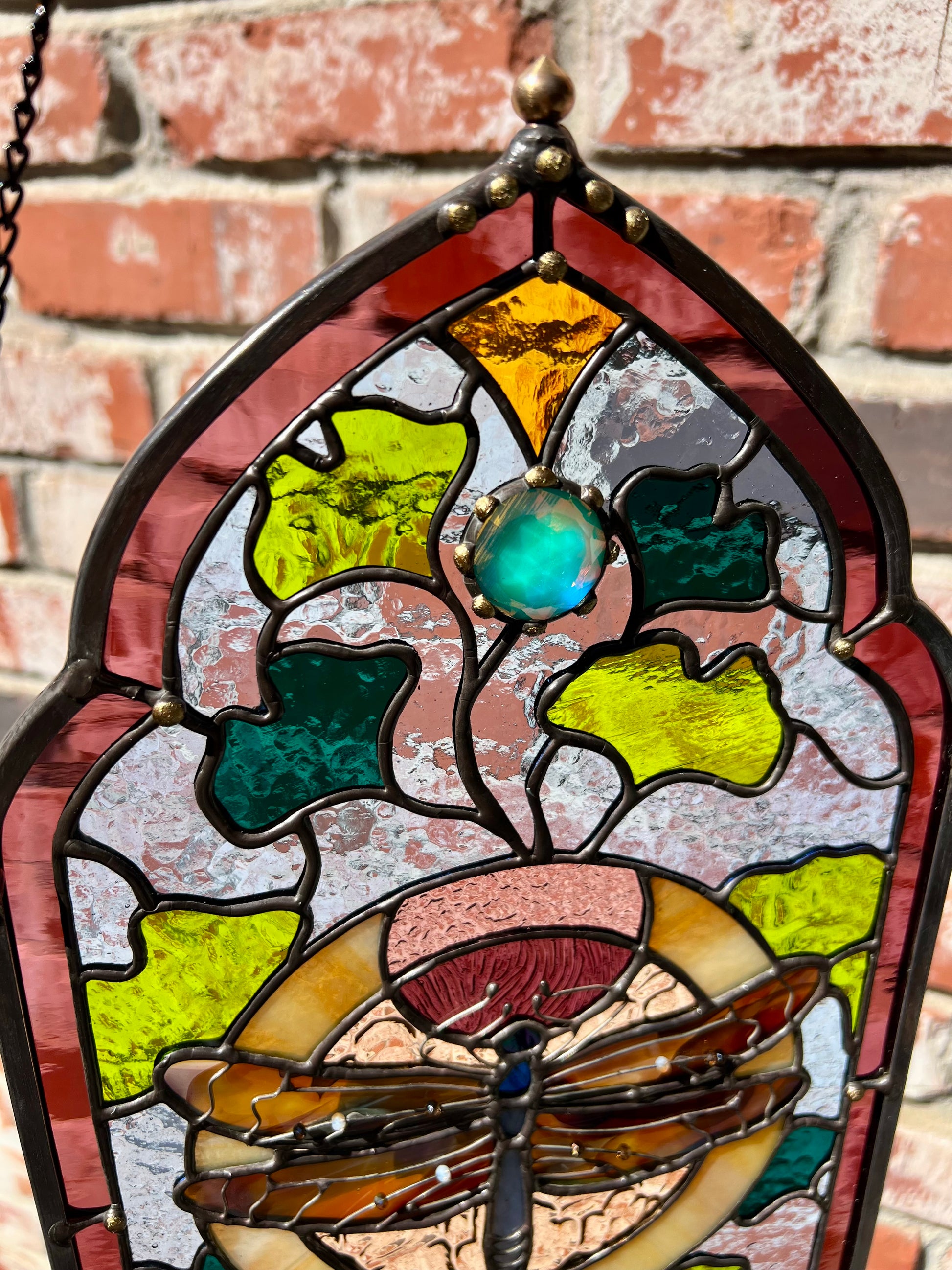 Inspired by the warm glow of summer, this piece features mouth-blown glass wings that shimmer with color and light. Tiny faceted glass beads add a touch of sparkle, while textured glass, a brass finial, and hand-painted bronze details bring richness and depth. The final touch - a dreamy dichroic gem that catches every glimmer of the season.