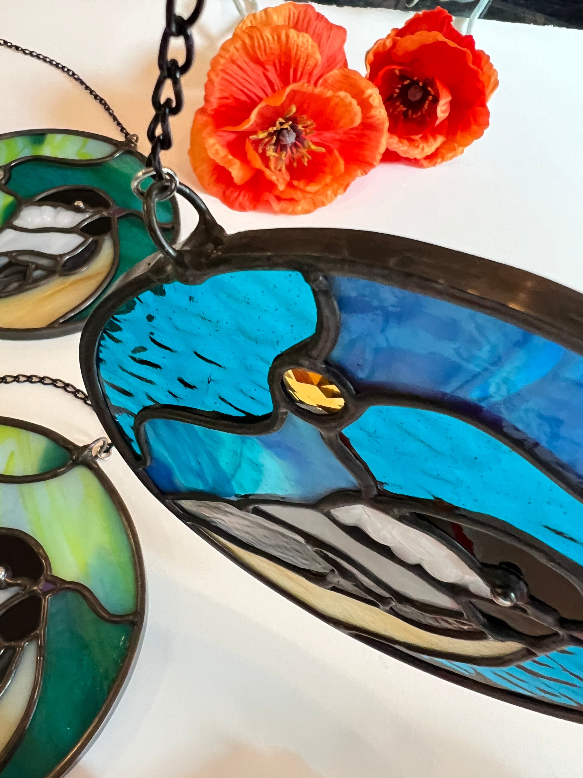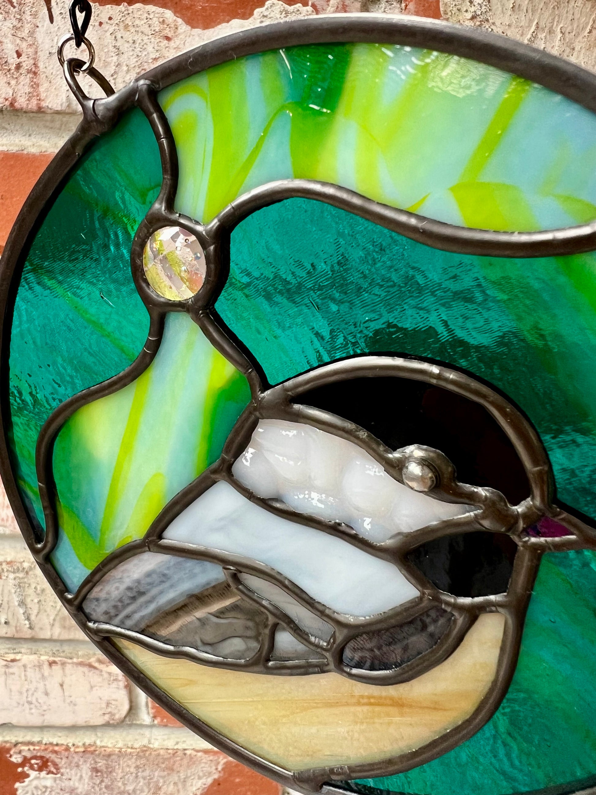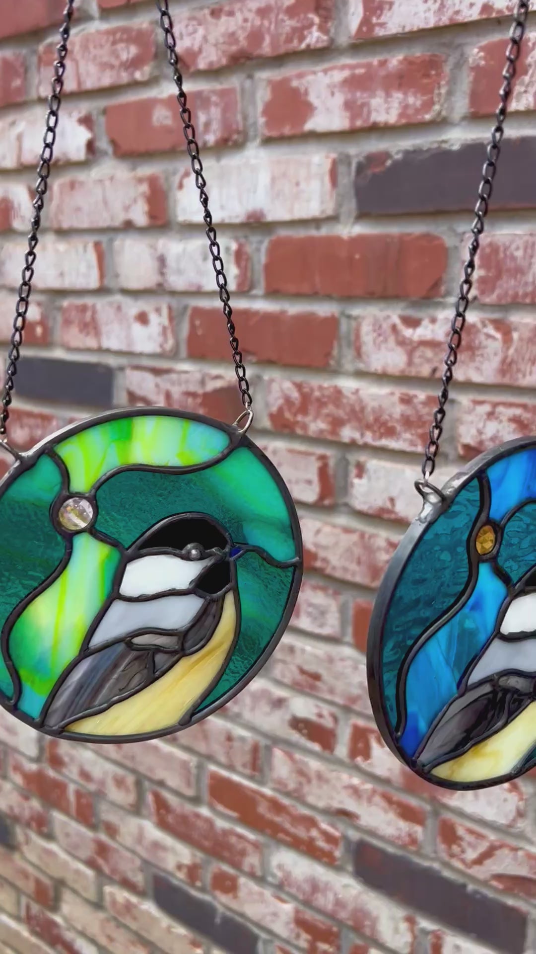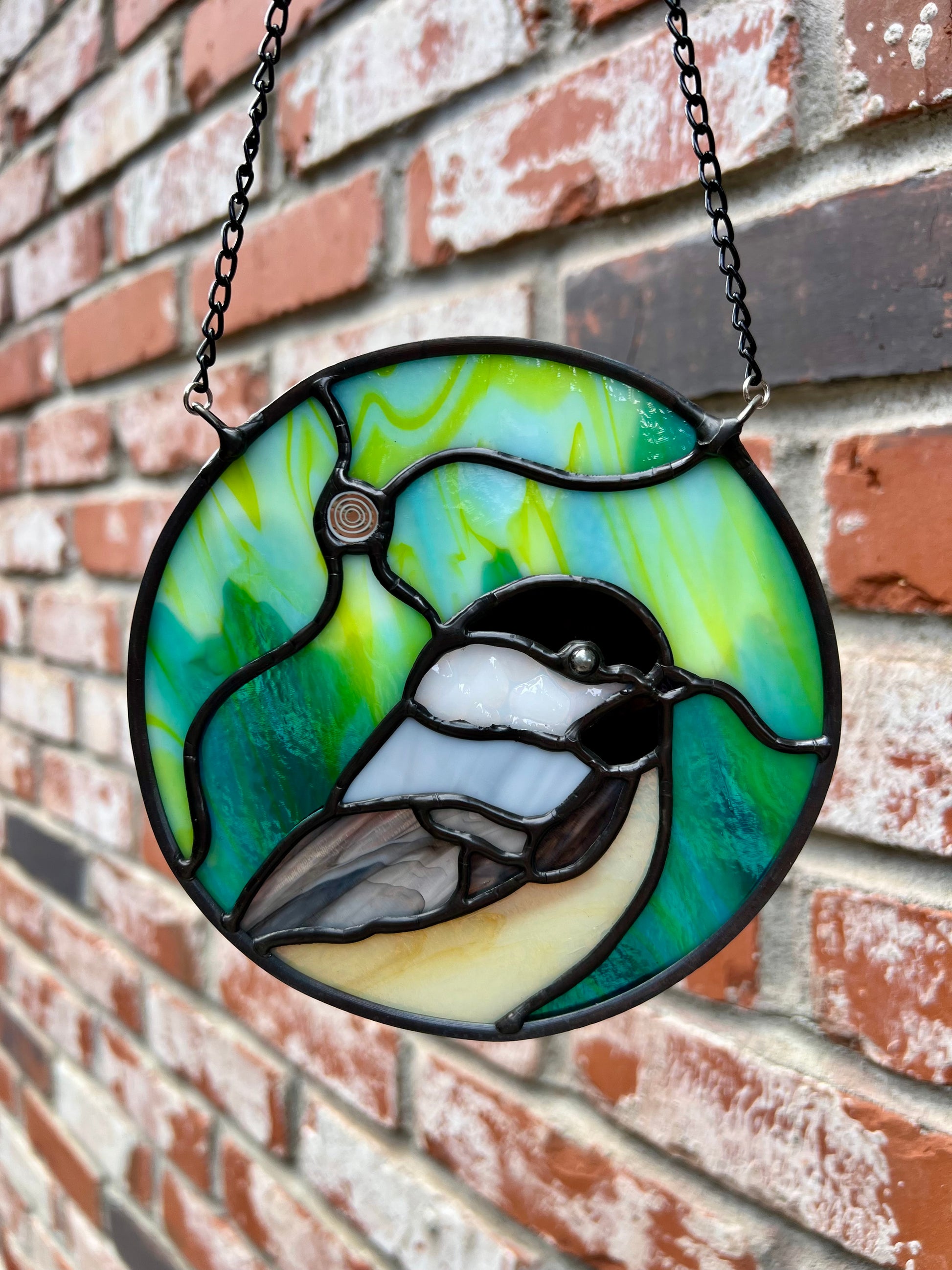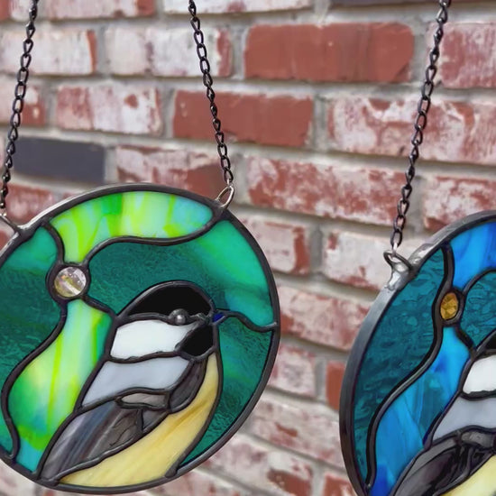 Set against a moody, urban-northern-lights sky, each little chickadee shines in their own unique way - glowing in jewel-toned blues, as well as teal and lime green hues.